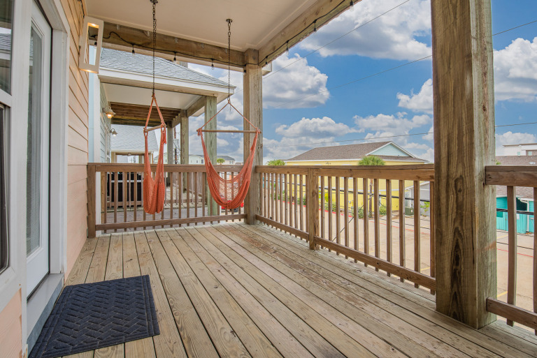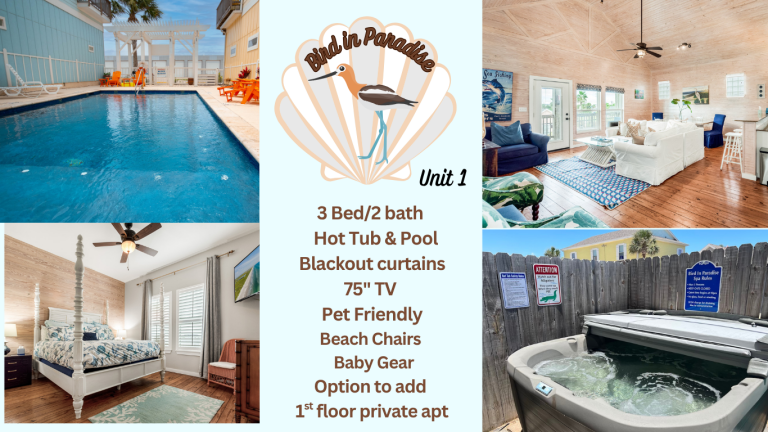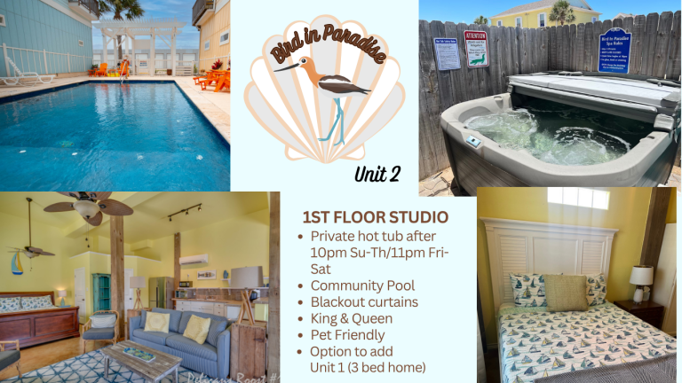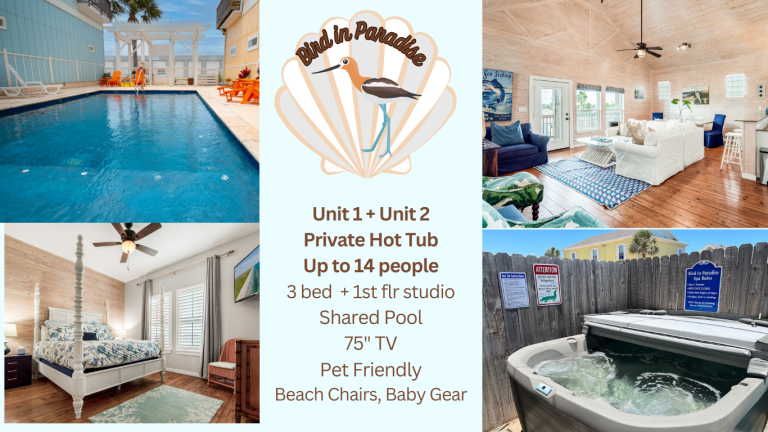 In town, on Paradise Pointe, approx 1/3 mi. North on 361 from Beach Access 1A. Book one or both levels of this stunning property with its own hot tub in yardm community pool steps away. Unit 1: 2nd floor 3 beds/2 baths, 1400sf (max 10 guests) Unit 2: studio apartment (max 4 guests) Book Unit 1: Hot tub hours: 10-10 weekdays (10-11 weekends) Book Unit 1 + Unit 2: Private hot tub (24 Hrs) Unit 2: Private hot tub after 10 (11weekends) Blackout curtains iand plush mattresses.