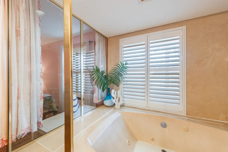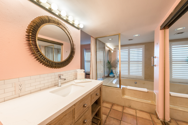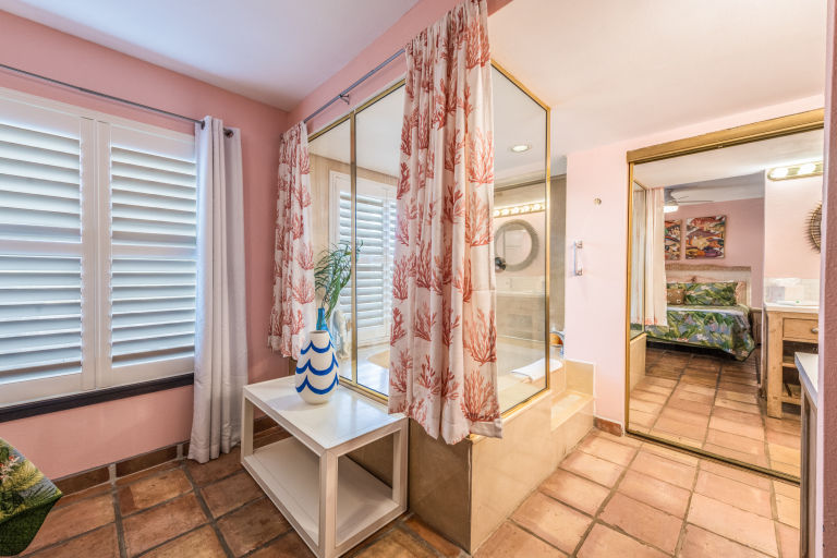 The primary BR is more private (it's down a long hall from the 2nd bedroom) and has a large tub/shower which is open to the bedroom - we have added curtains for more privacy. The commode and vanity are on the other side of the TV (they are not in a separate room). The original jacuzzi tub does work.