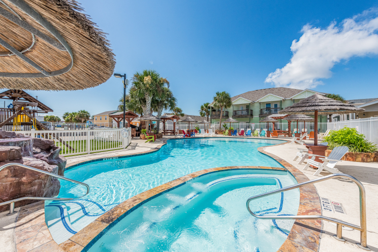 LUV Shack (#118) is especially popular due to its pool-front location. Amenities include plush mattresses, inviting furnishings and a well stocked kitchen. This spacious 2-story townhome has two equal sized king bedrooms and a bunk loftm(a nonconforming bedroom). There are 2 equal sized bathrooms (one with a deep bath and one with a shower both have handspray showers)